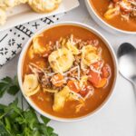 You will need at least a 6qt instant pot for this recipe.You can use any type of tortellini you like; cheese, beef, spinach & cheese, etc. You could also use ravioli.If using frozen pasta, add 2 minutes to the cook time.This soup can be kept warm in the pot for a few hours using the "keep warm" setting. It may thicken slightly as it sits and the tortellini absorbs more of the liquid. Time to pressure is approximate and will vary by pot.